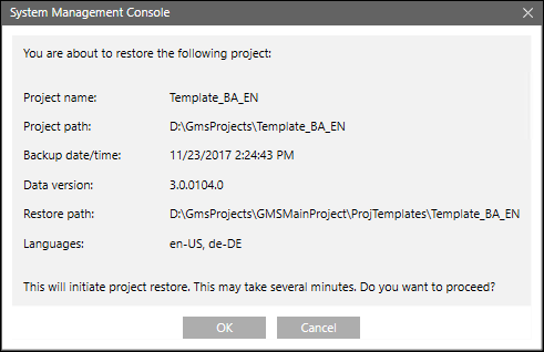 - Click OK to restore the selected project/project template.