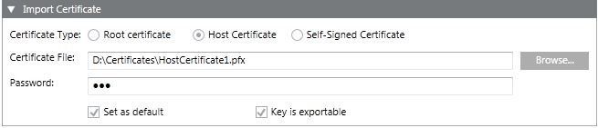 To import the host certificate, you must import the .pfx file of the host certificate.