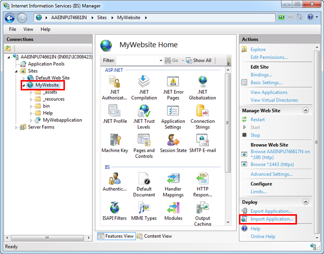 Select Sites > [website] and click ImportApplication from the Actions pane. NOTE: The Export Application menu displays only if you have installed Microsoft Web Deploy 3.6.