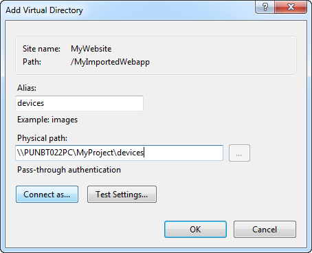 - In the Add Virtual Directory dialog box, click Test Settings to open the Test Connection dialog box.