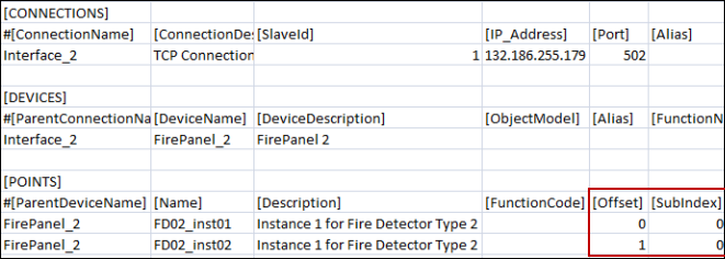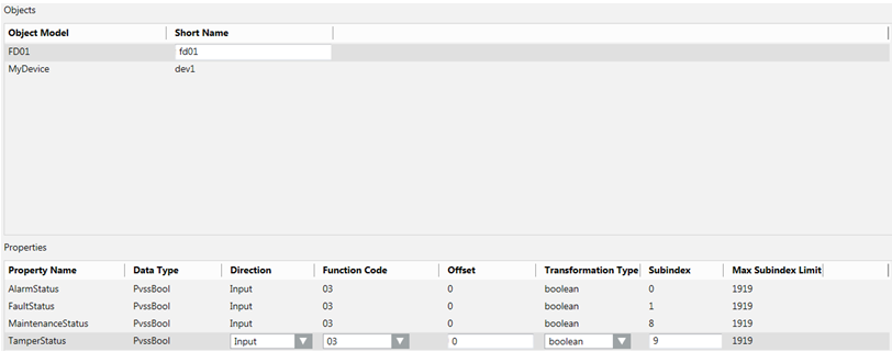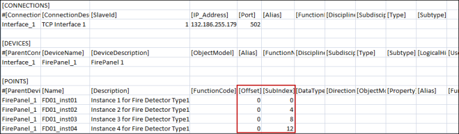 Fire Detector instance | Property | Offset in Object Model | Offset in CSV | Final Offset | SubIndex in Object Model | SubIndex in CSV | Final SubIndex |