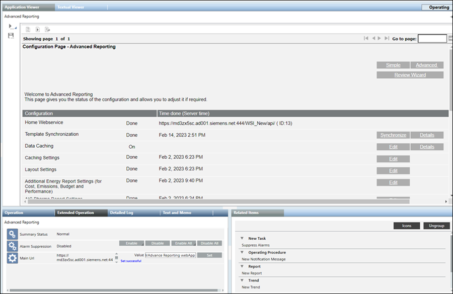- The Advanced configuration is applicable when want to work with creating reports related to caching, consumption, and so on for which you need additional configurations such as caching settings, layout settings, settings for configuring the look and feel of the report elements, and so on. For more information, see Energy Reporting and Pharma Reporting extension help.