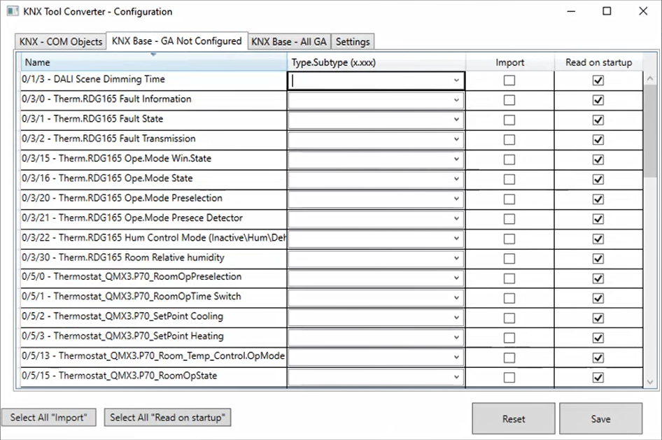 To get the list of the KNX objects with the group address not yet configured, define Type.subtype (x.xxx), and select the ones you want to import or read on startup, do the following: