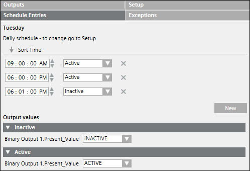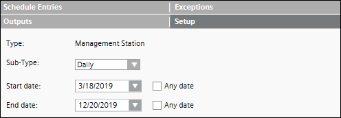 You can create a daily schedule from the Sub-Type drop-down list in the Setup tab and specify either similar active or inactive values for all days of the week or different values for individual days from the Schedule Entries tab.