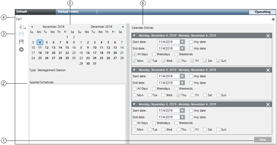 1 | New Button | Opens a new calendar entry. |