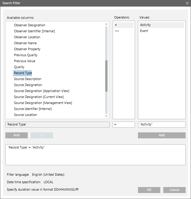 The Search Filter dialog box allows you to view a search filter condition and specify a filter condition on the columns that are not present in the log view.