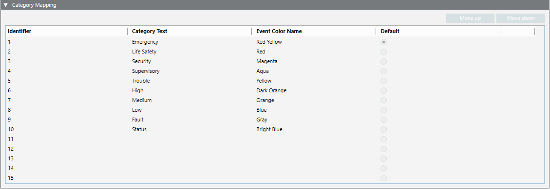 In Engineering mode, when you select an event schema, the Event Schema tab provides a Category Mapping expander which lists the categories and associated event colors defined in this schema. A maximum of 15 event categories can be defined.