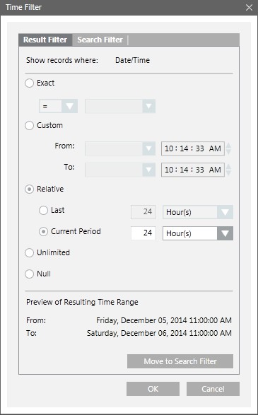 NOTE: By default, the Unlimited option is selected in the Time Filter dialog box. If you want to view records having NULL as the value, select the Null option. - A preview of the date/time values you specified displays in the Preview of Resulting Time Range section.
