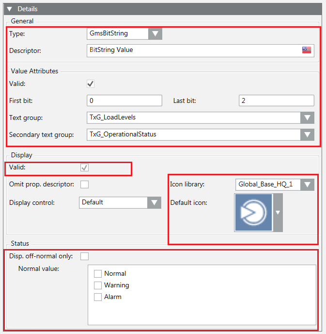 Properties | Optional | Object containing the valid range values. For details, see Table GmsBitString Properties, below. If the object is empty (“Properties”: { }), the range values are reset. |