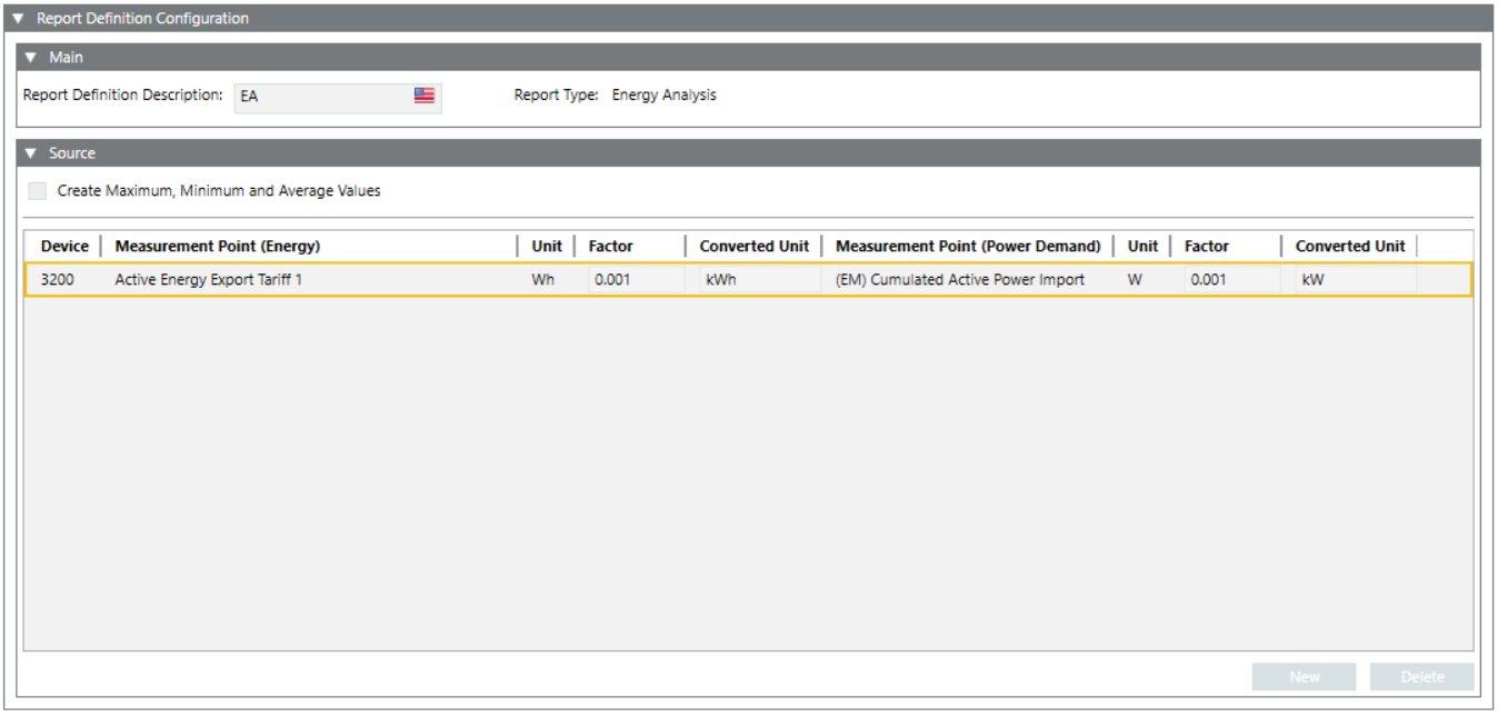 Enter values into the following columns: a. Select the required measurement point for which the report needs to be generated from the drop-down list under the Measurement Point(Energy) column. NOTE: You can configure only one device and generate a Energy Analysis report. b.Unit c.Factor d.Converted Unit e. Select the required measurement point for which the report needs to be generated from the drop-down list under the Measurement Point(Power Demand) column. f.Unit g.Factor h.Converted Unit