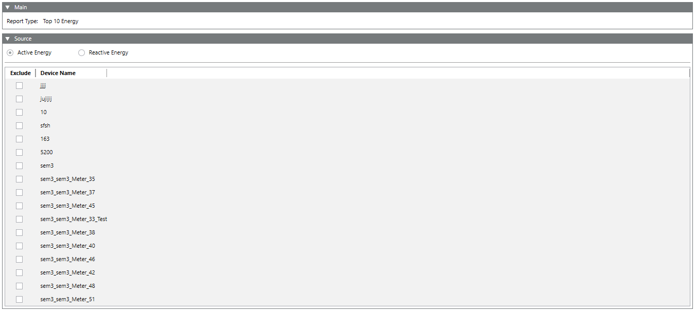 From the Source expander select either Active Energy or Reactive Energy to display the respective value for the top 10 devices. NOTE: You can drag the device to the Source expander to add a device as an alternative procedure.