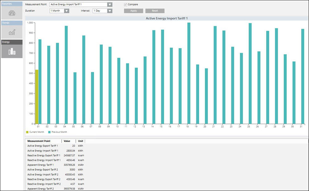 - Measurement Point: Displays the already configured measurement points. Active Energy import tariff 1, 1 hour and 15 minutes are the default values. Also, the Compare checkbox is unchecked by default. You can select any of these points to display the trend series for the point.