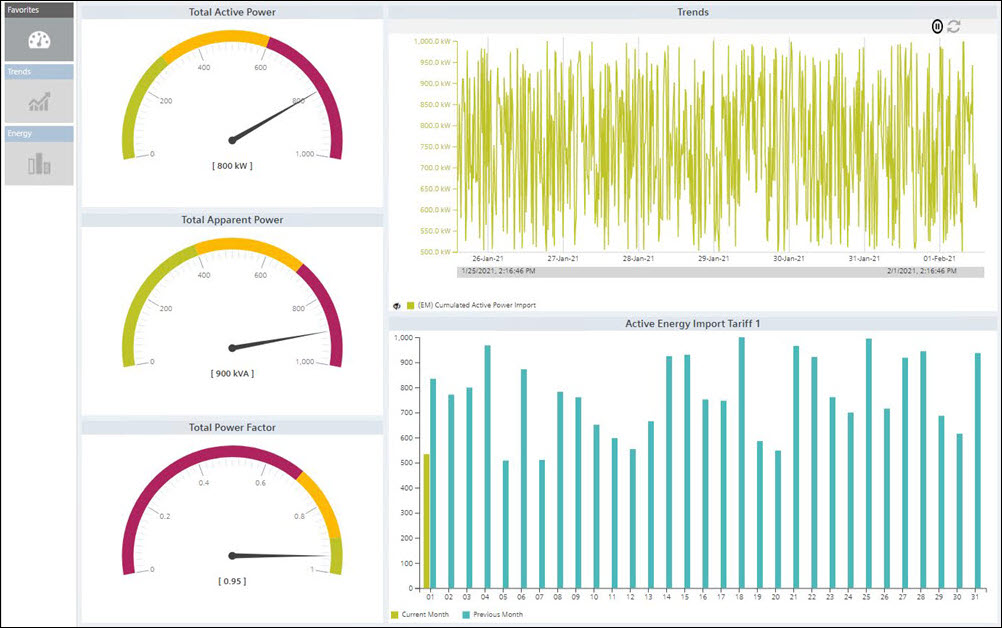 - Favorites: (default selection): Displays the control such as gauges and trends associated with their configured measurement points. There are three gauges that display the values of the configured measurement points.