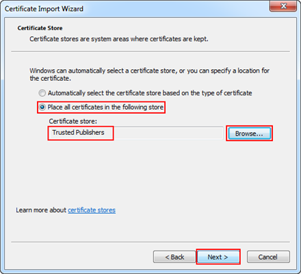 Select the Place all certificates in the following store option, and browse to and select Trusted Publisher Certificate store. NOTE: When installing certificates on the Windows 10 operating system, you must select the Windows store from where you want to import the certificate. For example, User Store.