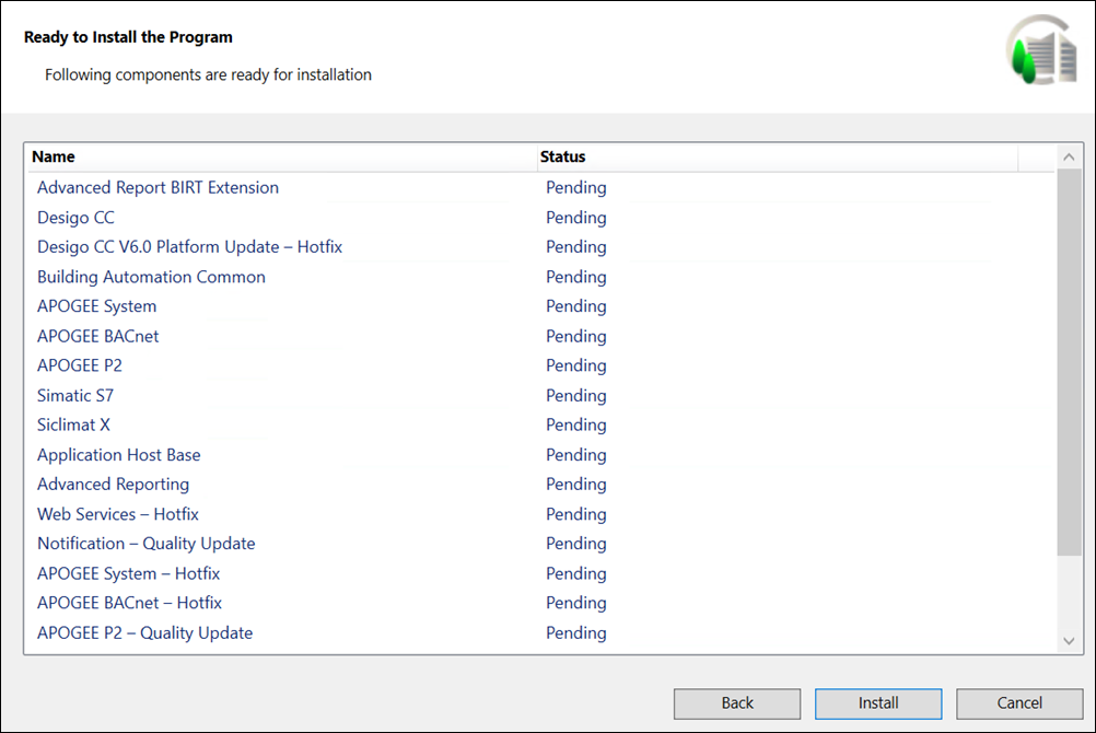 Click Next to display the Ready to Install the Program dialog box listing the status of the prerequisites, Desigo CC installation (platform + mandatory extensions), platform patch, non-mandatory extensions, mandatory extension patches, non-mandatory extension patches, help merging status, and the status of the post-installation steps that you selected for execution and status for those which are executed mandatorily.