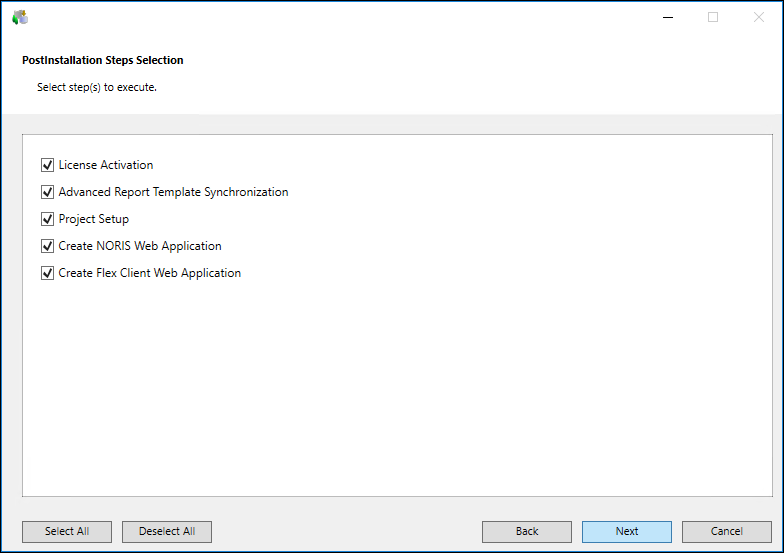 The PostInstallation Steps Selection dialog box displays listing the post-installation steps for the installed SetupType = Server/Client/FEP, for the already installed or newly selected extensions.