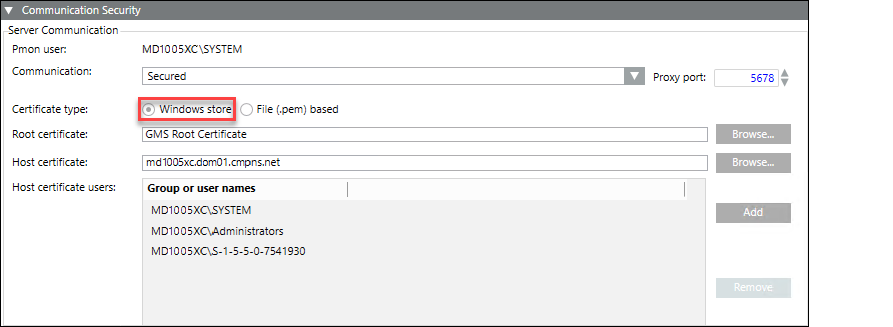 The Windows store certificates are imported in the appropriate Windows Certificate store. The file (.pem) based certificates are available on the disk. The Host certificate (Windows store/File (.pem) based) is created using the root certificate provided in the Root certificate field. The Host certificate must have a private key and it must be exportable.
