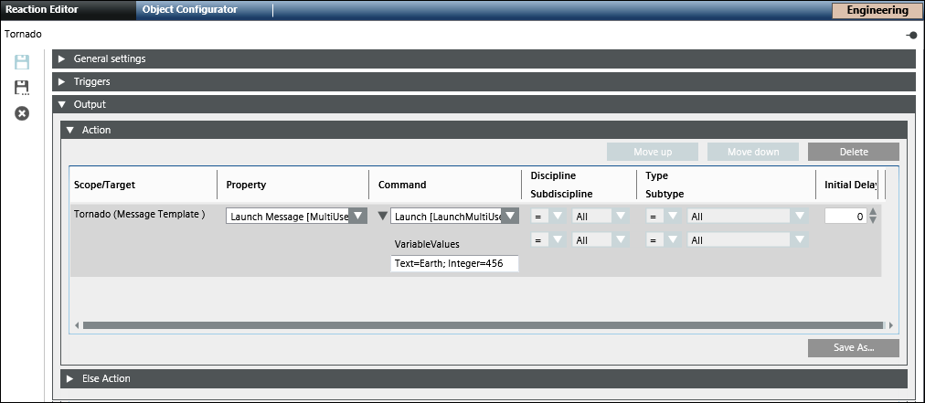 - Drag a Message template, for example, Fire trigger, to the Action expander.
