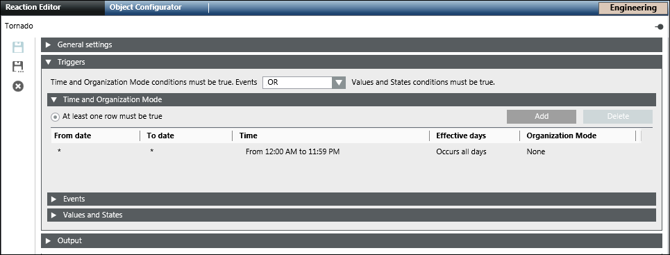 NOTE 2: For multi select user variables, enter the variable values separated by a comma and a space after the comma. For example, List=0, 1, 2. - In the Triggers expander, specify if the conditions specified in both, the Events as well as Values and States, expanders must be true or if the conditions specified in either of the expanders must be true by selecting the appropriate operator (AND, OR) in the drop-down list.