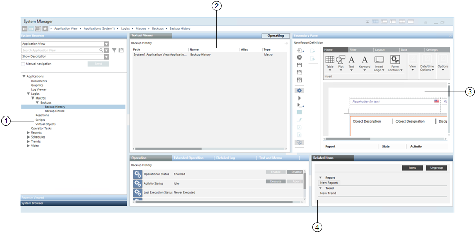 System Manager is a multi-pane window for navigating, monitoring, and controlling all the components and subsystems of your site. For example, you can inspect properties and states of objects, send commands, browse the architecture of the installation, consult floor plan graphics, and so on. A typical layout has a Selection pane on the left where you can locate and select system objects from a hierarchical tree view, and multiple working panes on the right that display object properties, commands, and associated applications based on the current selection.