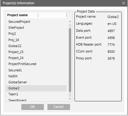 The Projects Information dialog box allows you to select a project from a list of all available projects on the selected Server including the Stand-alone and Unsecured projects. The list does not include the outdated projects on the Server.