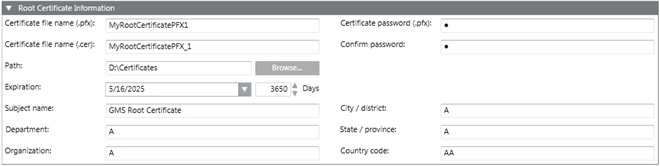 When you click Create Certificate > Create Root Certificate (.pfx), the Root Certificate Information expander displays. This allows you to create a .pfx root certificate.