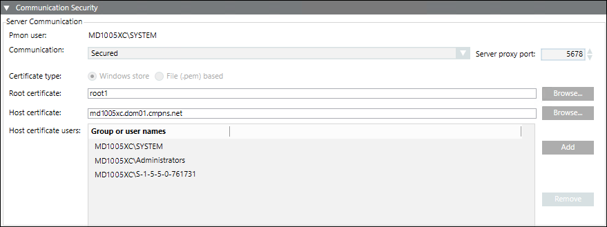 - When you configure a server project with Communication mode set to secured, you must provide the same root certificate as the one configured on the server.