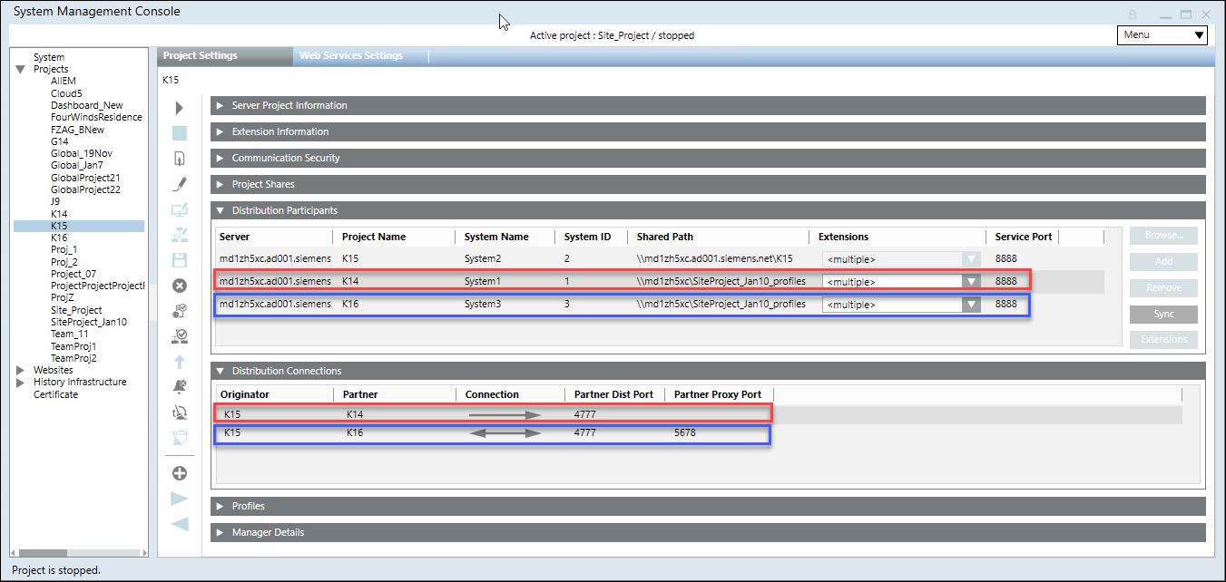 When you add the distribution partner project in automatic mode, the partner dist portand the partner proxy port values are automatically updated in the Distribution Connections expander. However, when you add the distribution partner project in manual mode, you must type in the correct partner proxy port number in the Distribution Connections expander for all the non-local linked secured distribution participant projects having the partner dist port configured. |