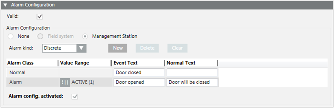 - In the Alarm Configuration expander, the Alarm config. activated check box is selected.
