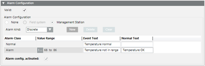 - Discrete alarm, for example, an alarm range of 68 through 86 or a listing, such as 70, 80, 90.