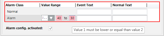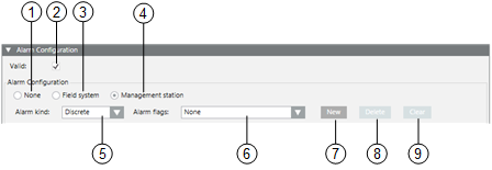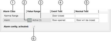 6 | Alarm config. activated | When the check box is selected, the alarm is set to active. |