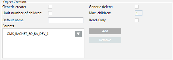 NOTE: Permits the creation or deletion of an object in the Object Configurator. - Select or clear the Limit number of children check box. You must also define the limits for an activated check box (unchecked = unlimited).