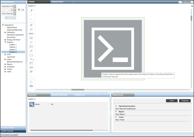 In System Browser, expand the Reports folder and drag the report definition to be executed to the window labeled Untitled in the Graphics editor.