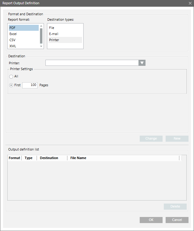 The Report Output Definition dialog box allows you to send a Report Output Definition to a printer.