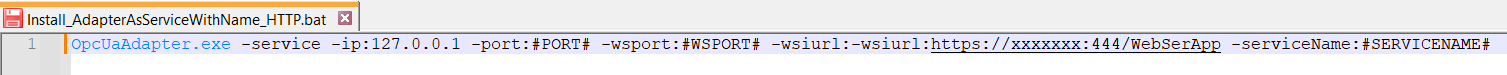 - In C:\Program Files (x86)\Siemens\OPC UA Adapter, open the file Install_AdapterAsServiceWithName_HTTP.bat with a text editor.