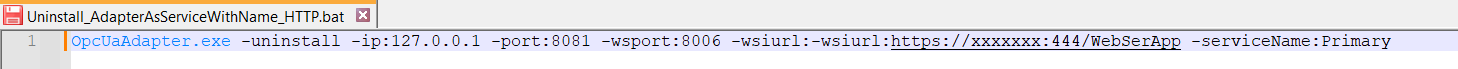 - In C:\Program Files (x86)\Siemens\OPC UA Adapter, open the file Uninstall_AdapterAsServiceWithName_HTTP.bat with a text editor.